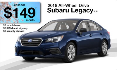*Now through May 31, 2018 Lease a new 2018 Legacy for $149/Month on a 36-Month Lease (Standard 2.5i model, code JAB-01). 10,000 miles per year. $2,999 due at lease signing. $0 security deposit. Subject to credit approval. Call for details.