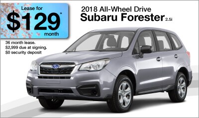 *Now through May 31, 2018 Lease a new 2018 Forester for $129/Month on a 36-Month Lease (Standard 2.5i 6MT model, code JFA-01). 10,000 miles per year. $2,999 due at lease signing. $0 security deposit. Subject to credit approval. Call for details.