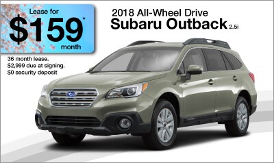 *Now through May 31, 2018 Lease a new 2018 Outback for $159/Month on a 36-Month Lease (Standard 2.5i model, code JDB-01). 10,000 miles per year. $2,999 due at lease signing. $0 security deposit. Subject to credit approval. Call for details.