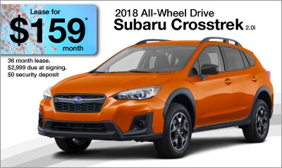 *Now through May 31, 2018. Lease a new 2018 Crosstrek for $159 per month on a 36-month lease (Standard 2.0i model, code JRA-01) plus tax and tags. 10,000 miles per year. $2,999 due at lease signing. $0 security deposit. Subject to credit approval. Call for details.