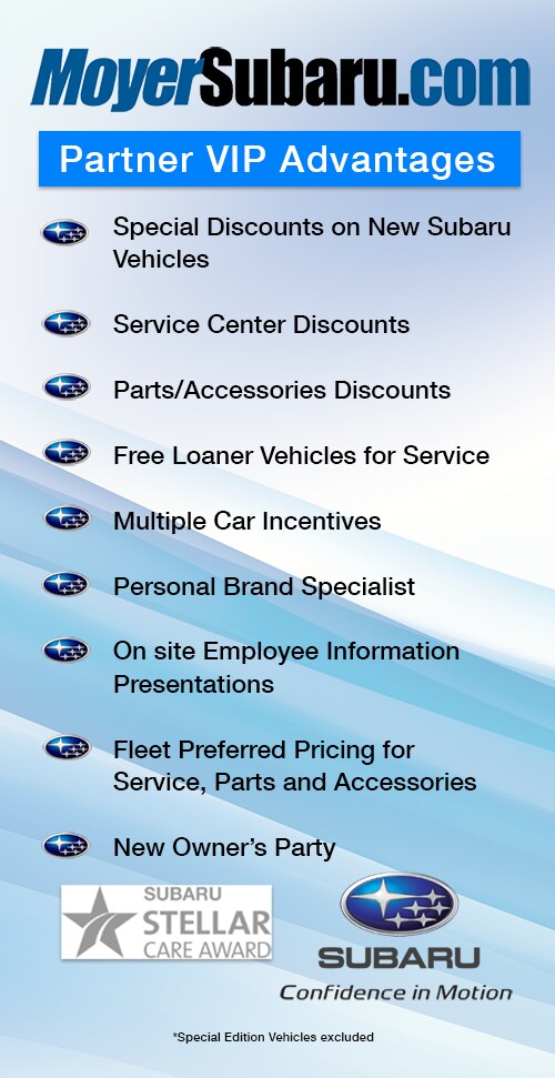 Our goal is to provide a truly exceptional experience to our partners. From sales, to service, to a state of the art collision center, Steve Moyer Subaru is conveniently located to handle your vehicle needs, whether your organization is a sole proprietorship or a corporation, we are proud to offer our Partner VIP Program to you.